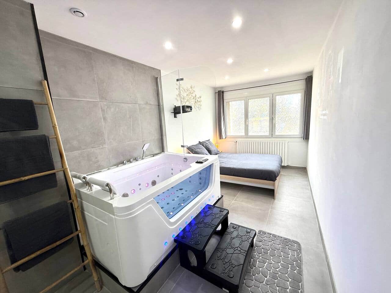 Lit double, balnéothérapie double, rétroprojecteur, douche à l’italienne, vasque.